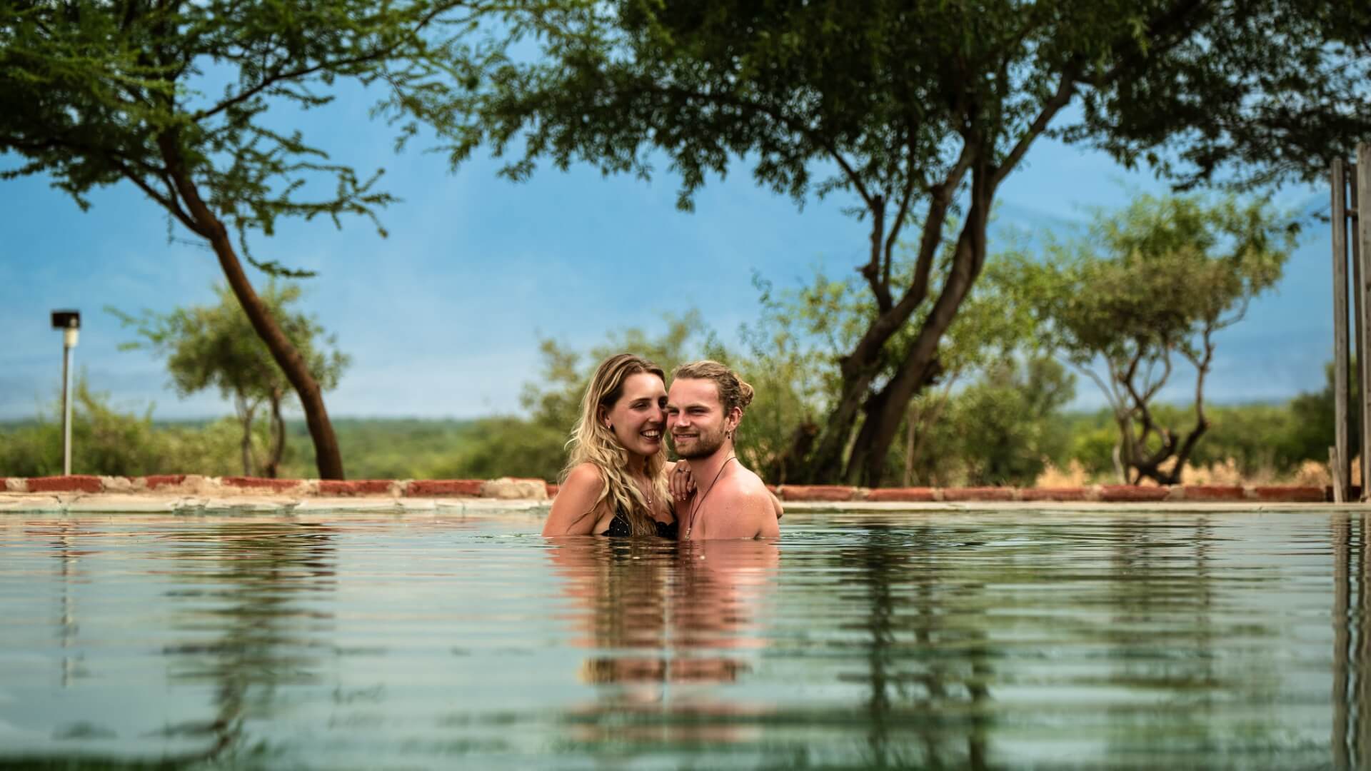 Tented safari lodge with long rectangular pool and sun loungers on a raised stone terrace, hammocks and bushland views
