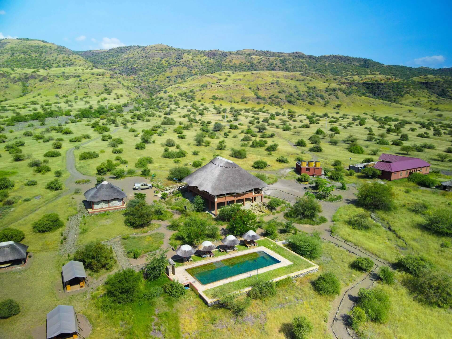Thatched-roof lodge with outdoor seating and small pool, surrounded by green hills and clear blue sky with scattered clouds