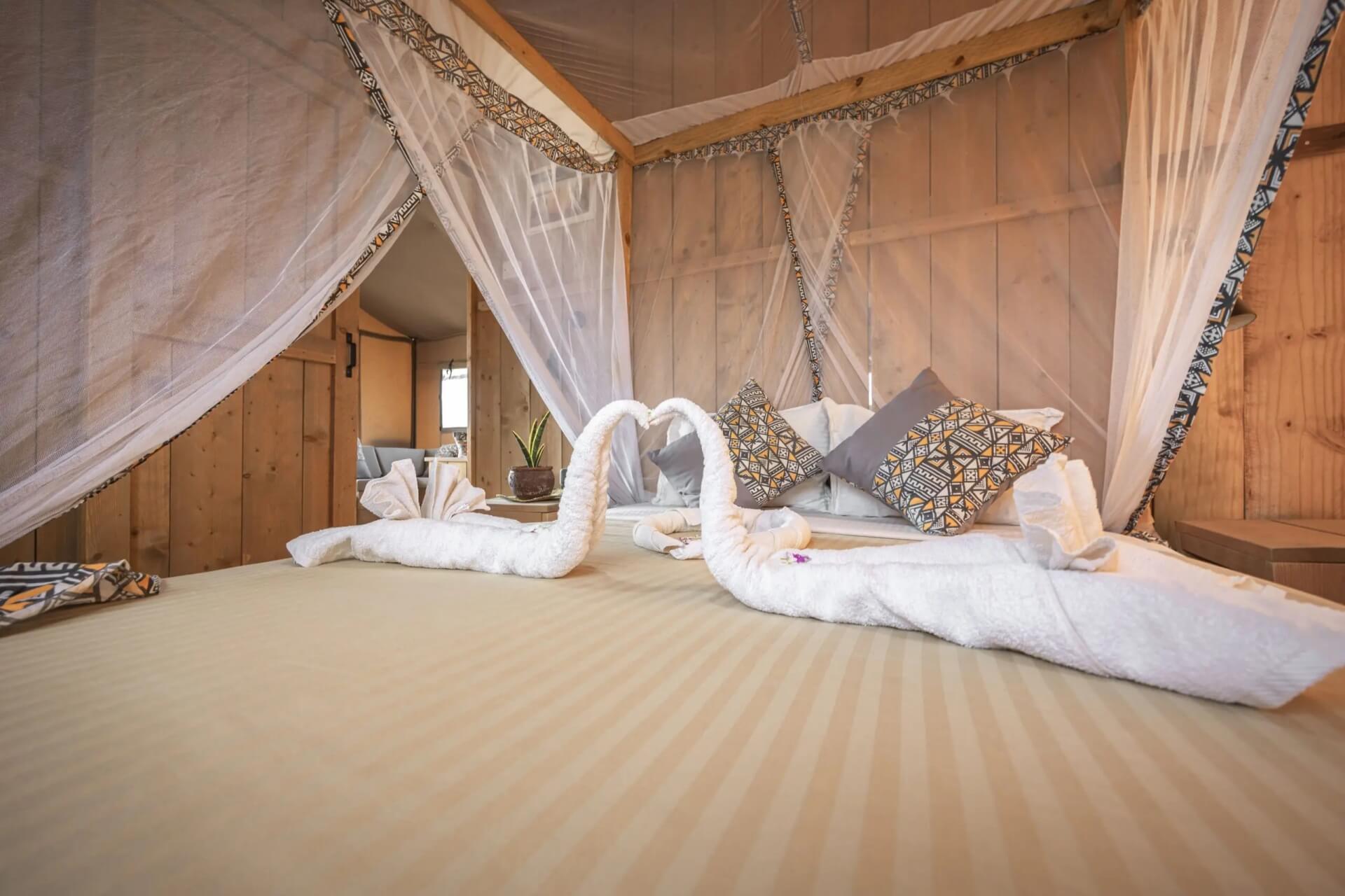 Luxury safari tents nestled near acacia trees with zebras and wildebeests grazing on the vast open savannah